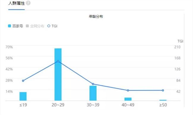 那么目前百家号这个平台的粉丝年龄主要集中在20- 29 岁,占了整个平台的66.37%,30- 39 岁的粉丝占了19.35%,除此之外,还有一些小部分的群体。那么从下面这张图就可以看出,百家号这个平台的粉丝多以年轻人为主。