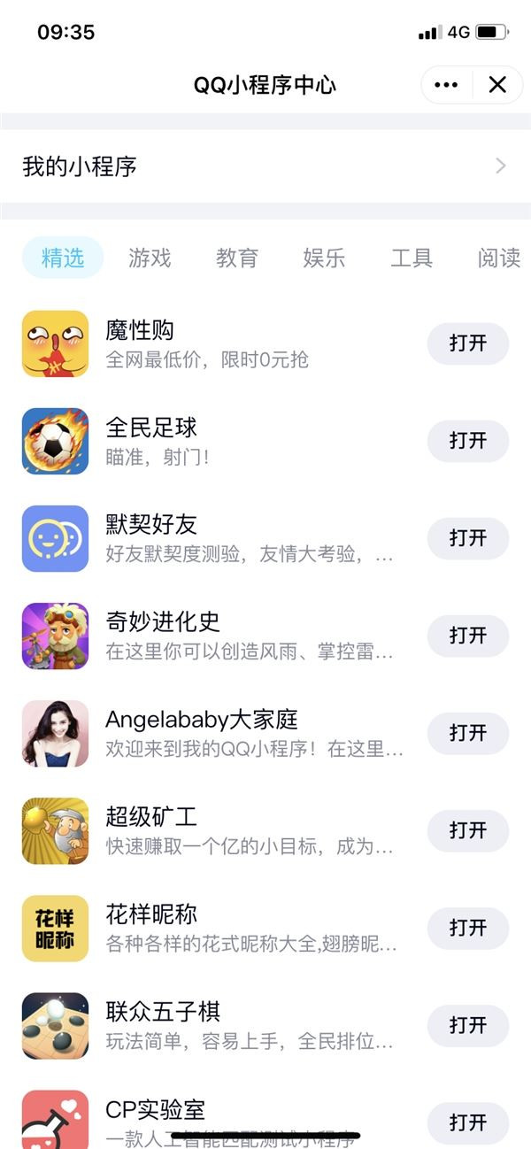 点击最右侧的“更多”,便可进入“QQ小程序中心”,除了顶部的“我的小程序”外,下方则类似于应用商店,方便使用者挑选QQ小程序。